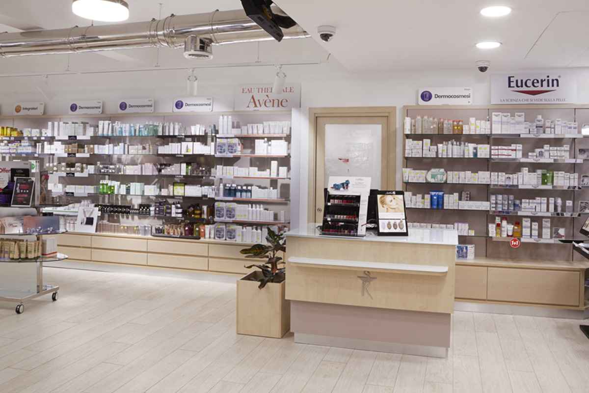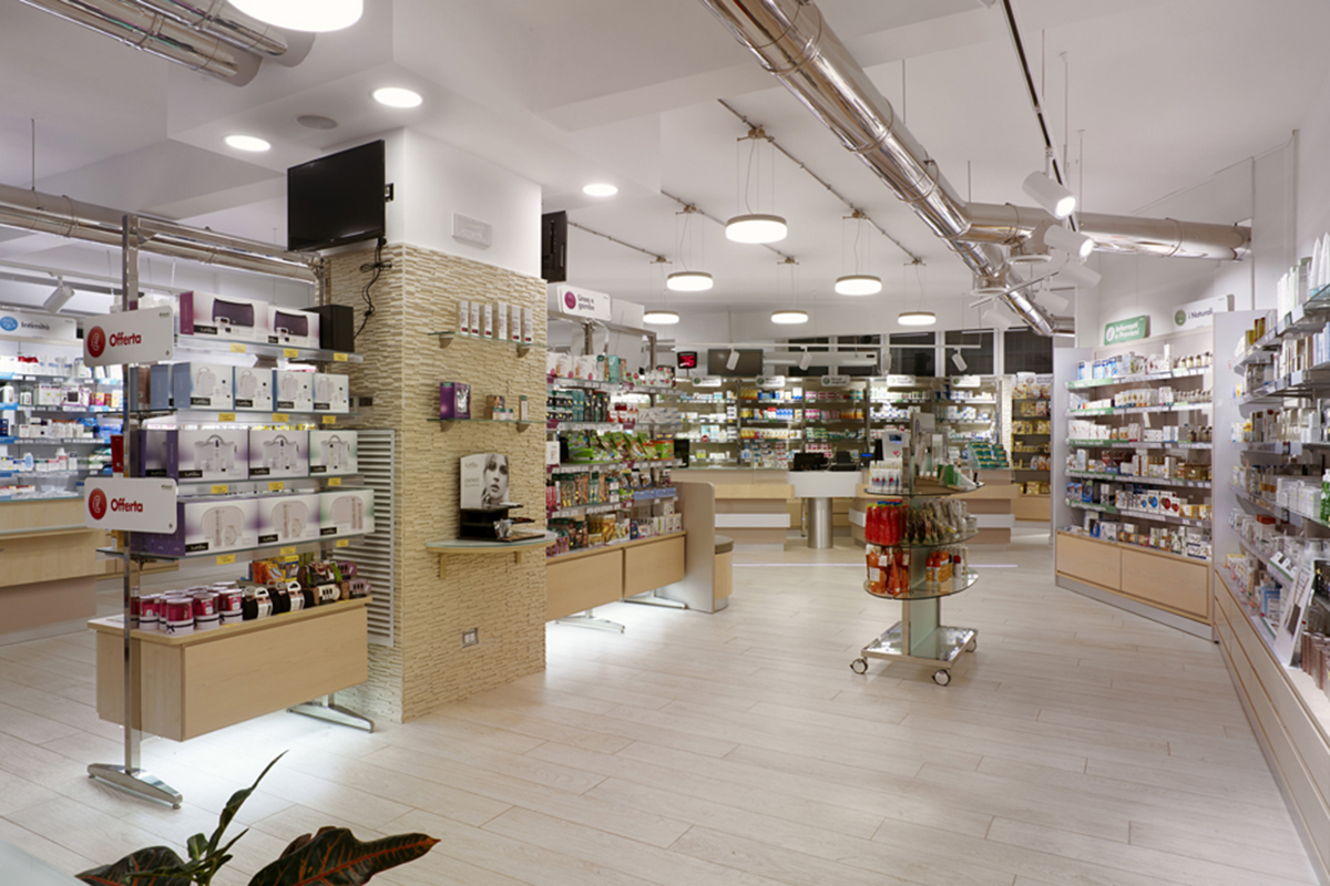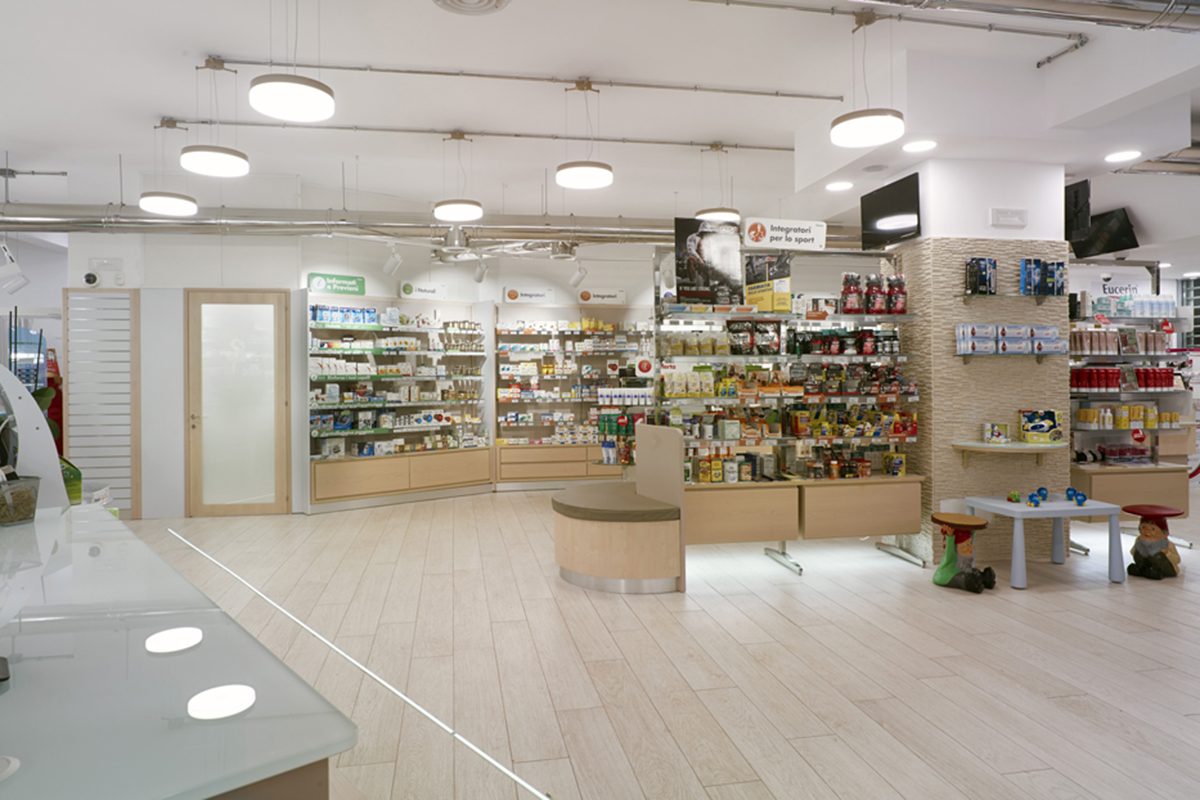 Il layout farmacia è stato studiato con percorsi mirati, realizzati mediante la disposizione di gondole per farmacia ed espositori autoportanti sottoilluminati a led con struttura in acciaio, scorte a cassetto in legno acero e comunicazione superiore/laterale.