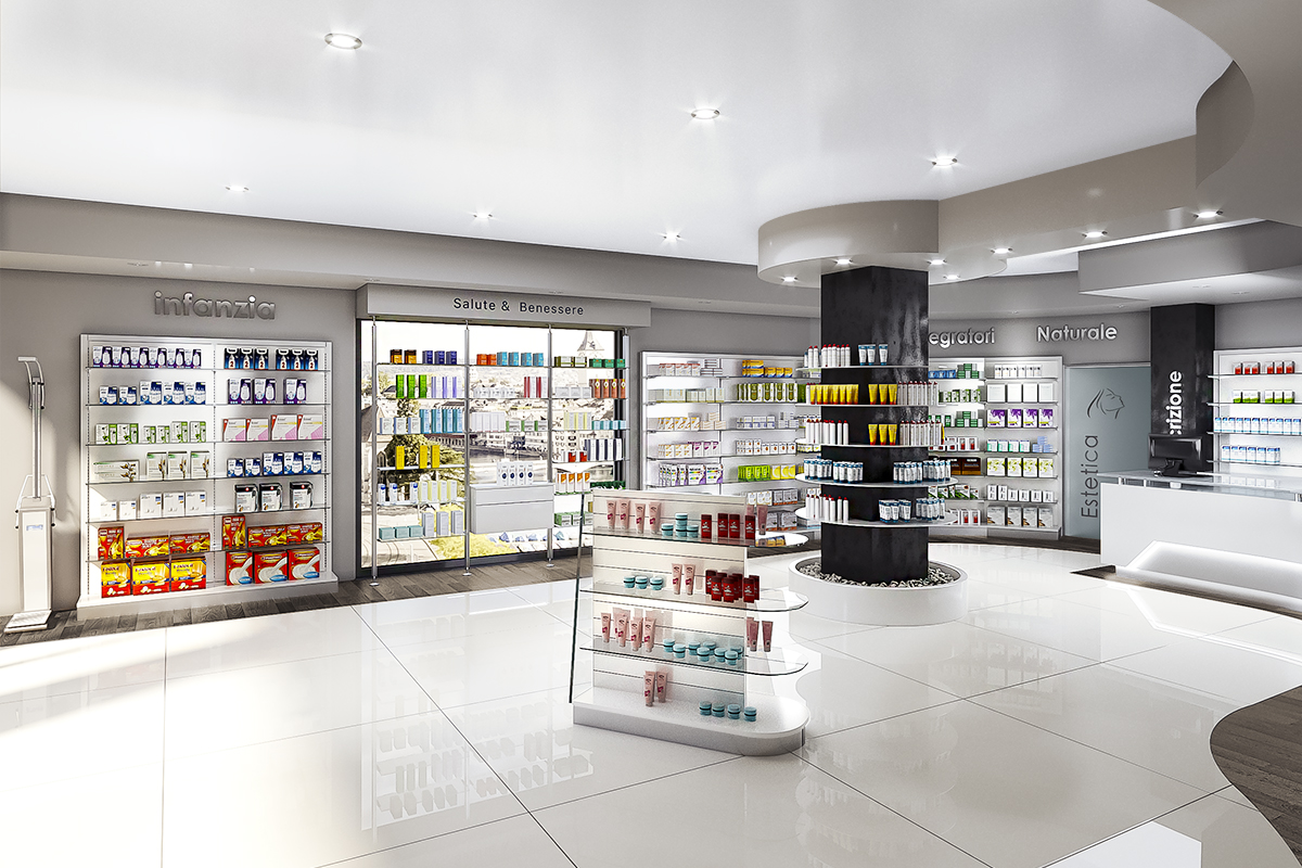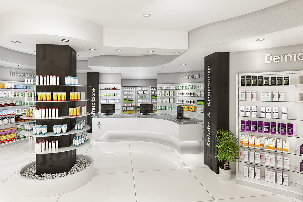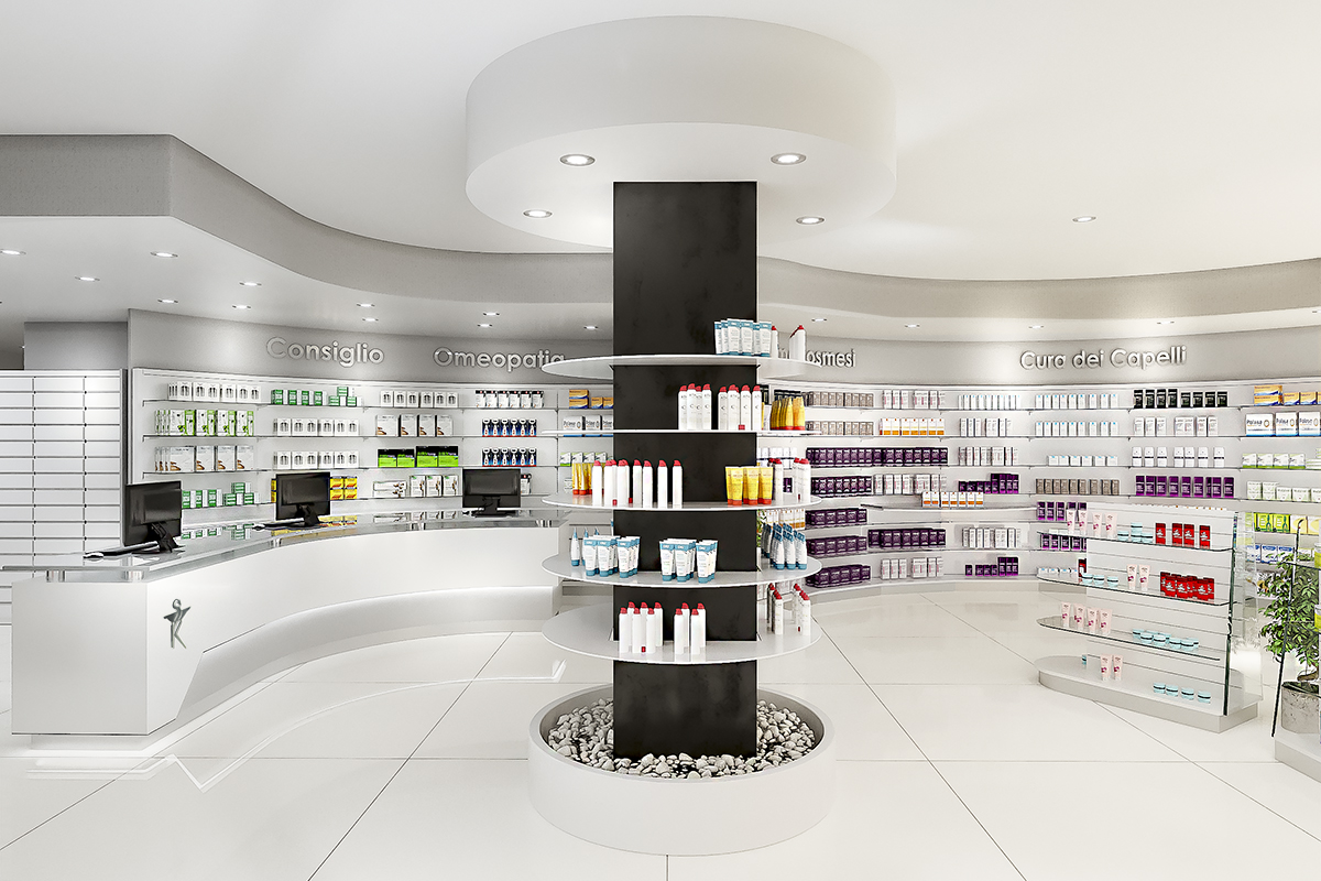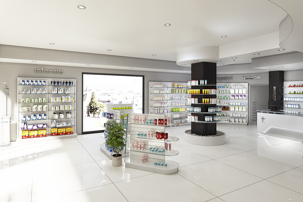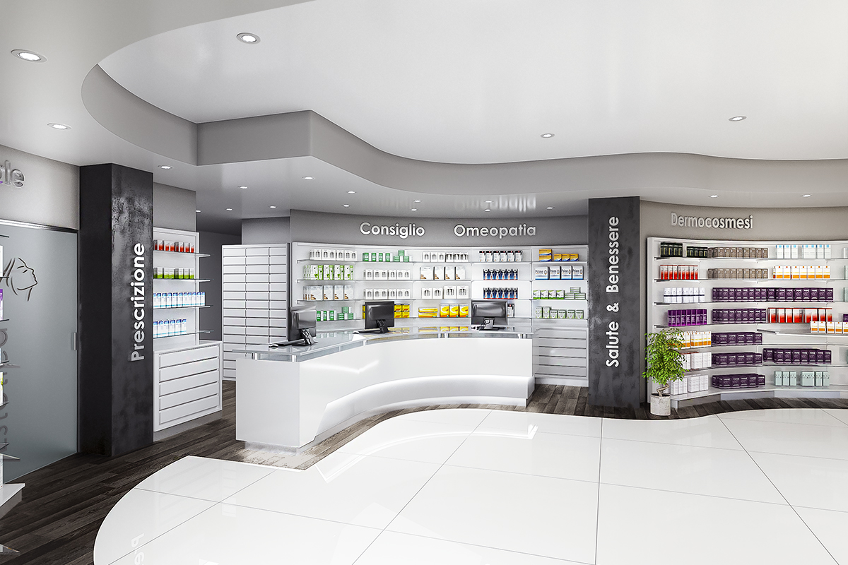 Progetto: Nuova Apertura Anno: 2019 Area Vendita: 190 mq Dove: Castel Fusano (RM) Rinnovo Arredo Farmacia Imperia Realizzazione precedente Ristrutturazione Farmacia Dott.ssa Minghini Realizzazione Successiva