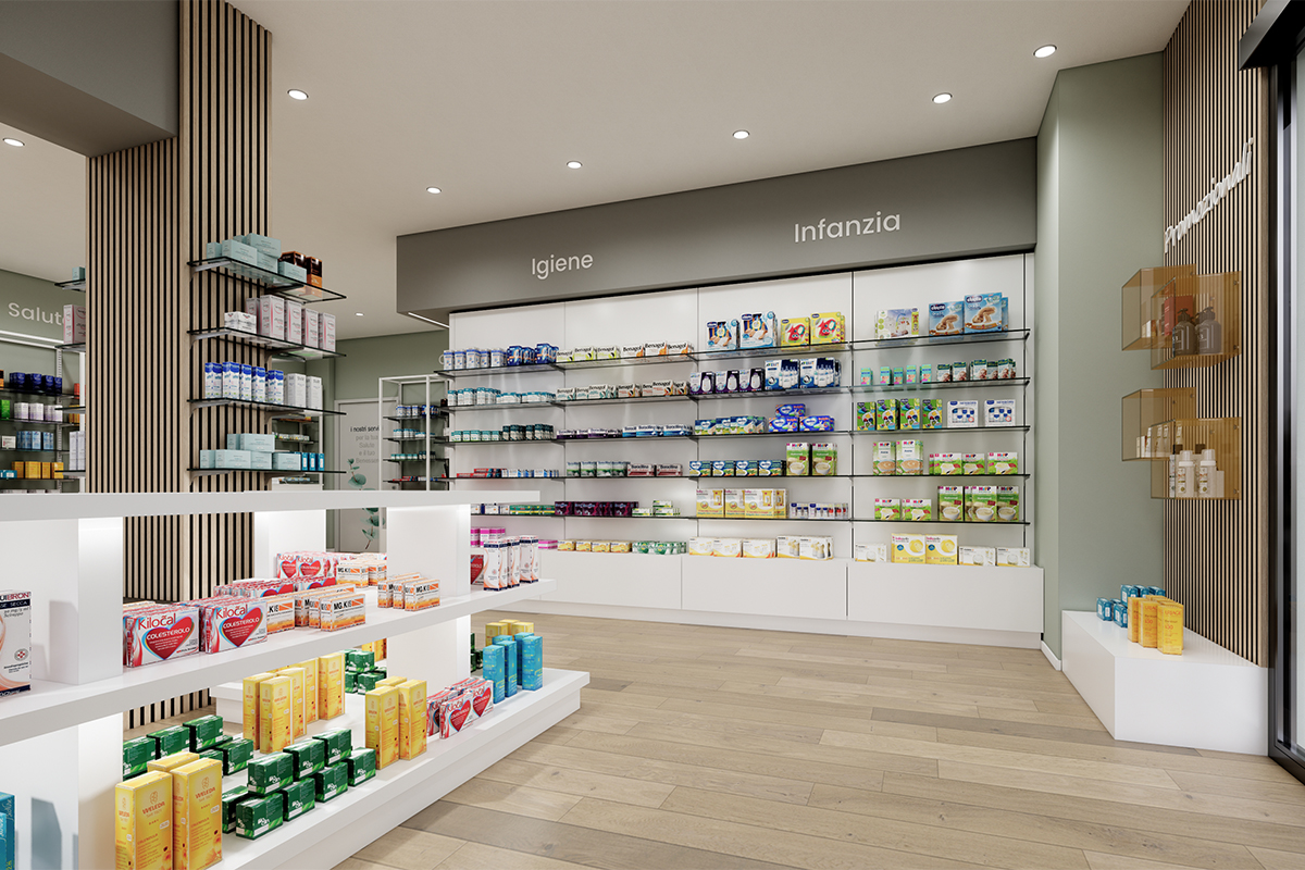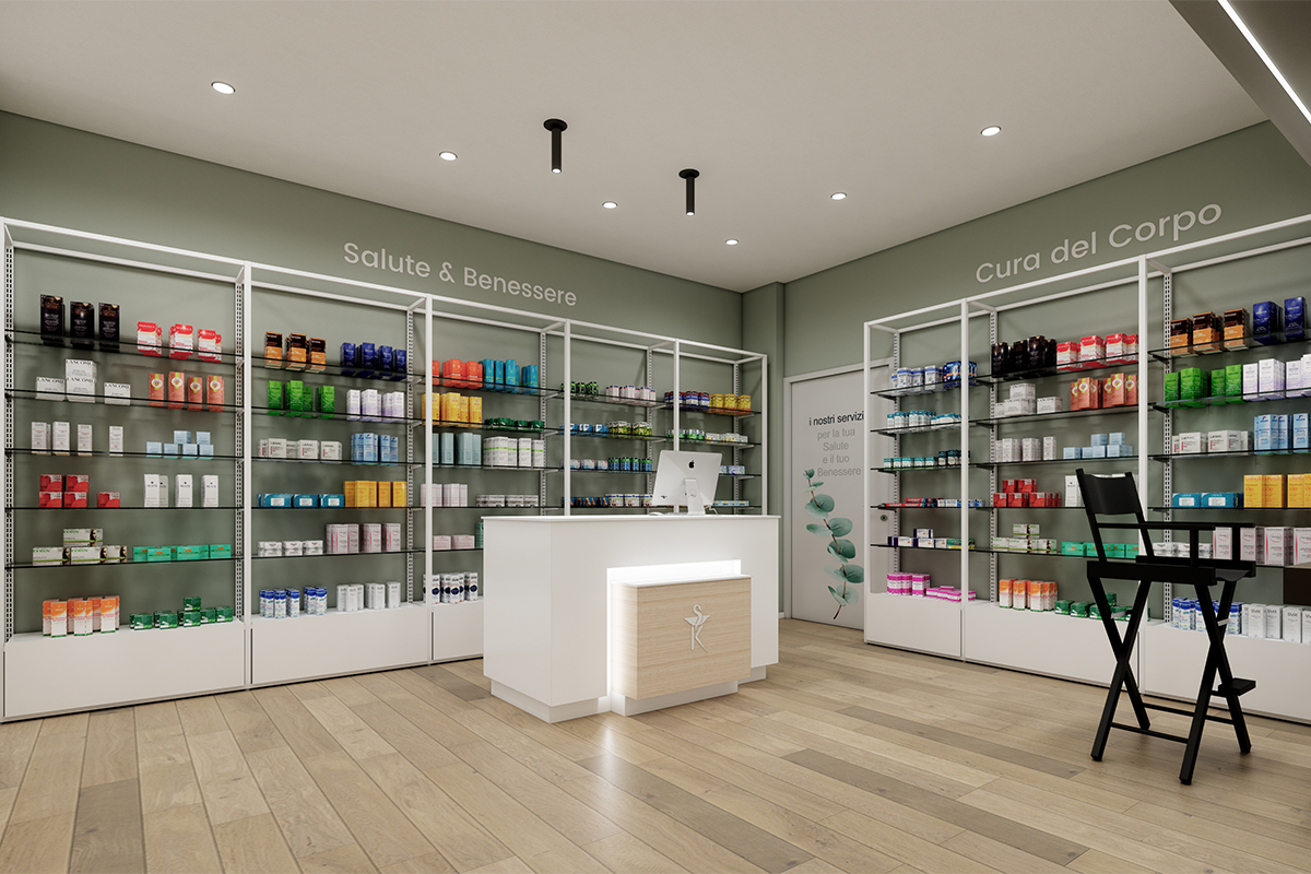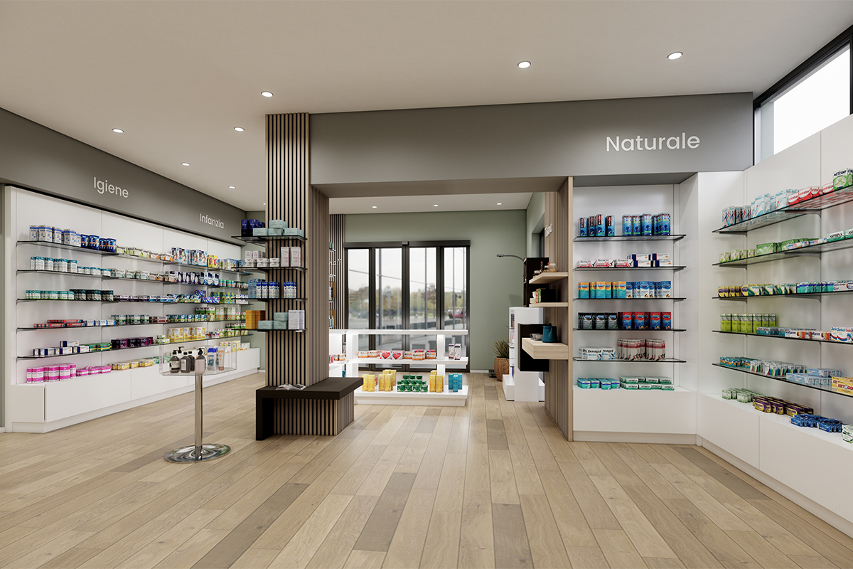 Progetto: Ristrutturazione Anno: 2023 Dove: Somma Vesuviana Napoli Nuovo Locale Farmacia Pace Sciacca AG Realizzazione precedente Nuovo Arredo Farmacia Moderna Prato Realizzazione Successiva