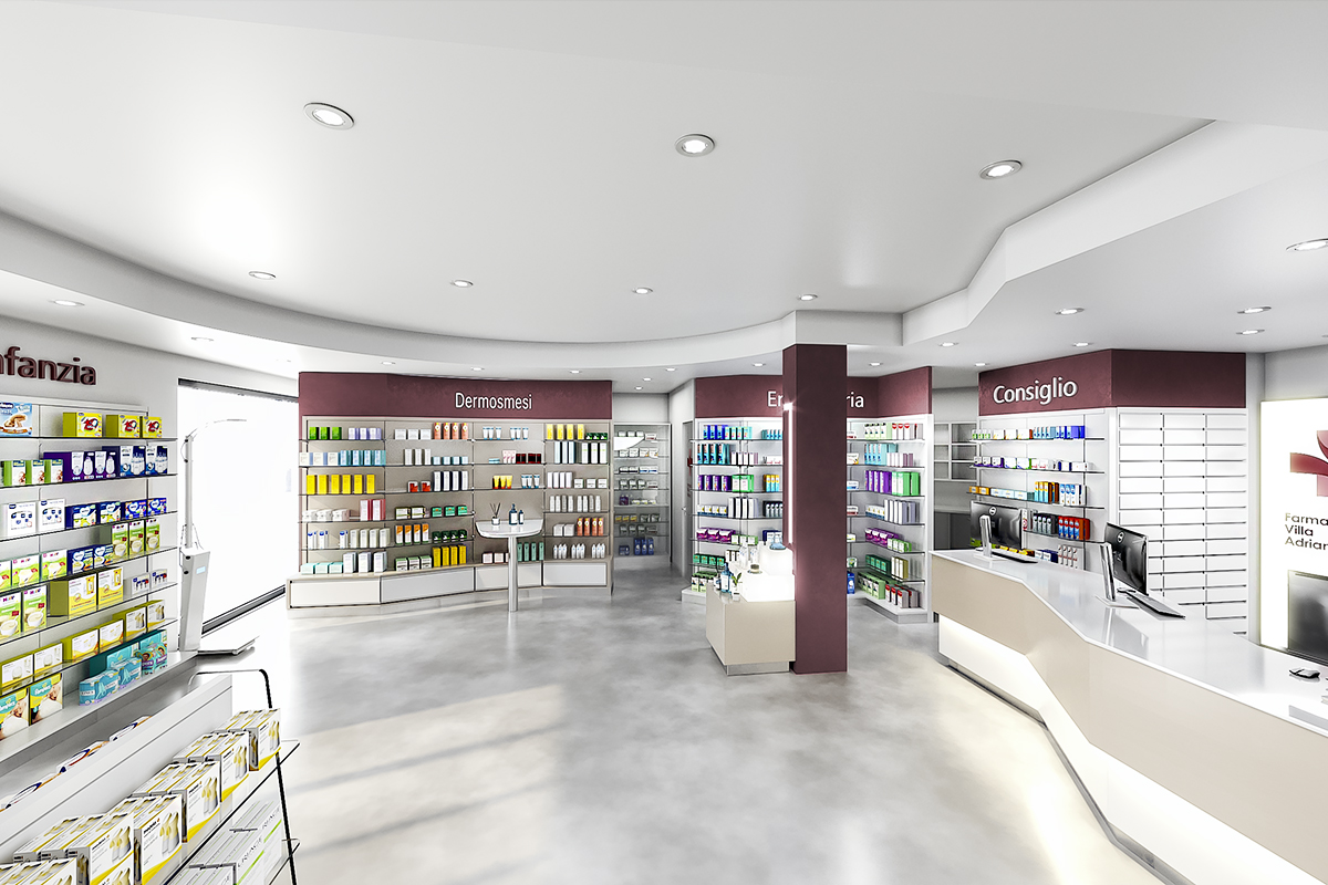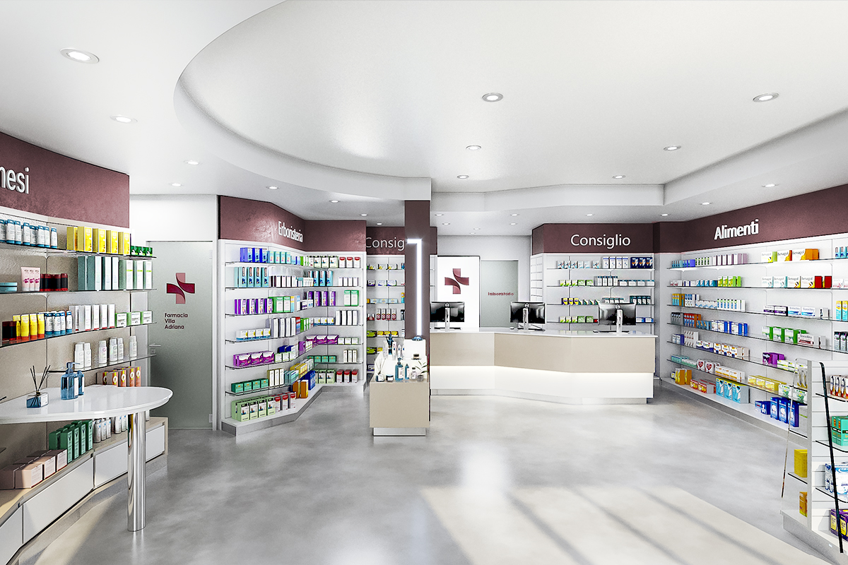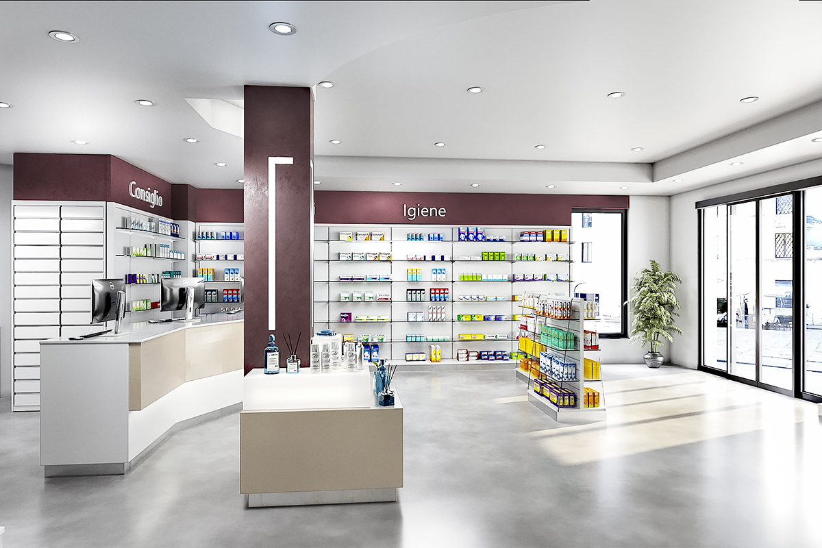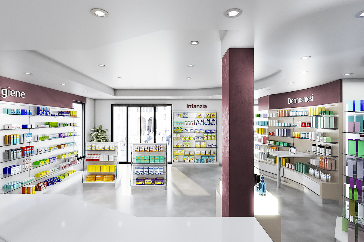 Progetto: Nuova Apertura Anno: 2020 Area Vendita: 88 mq Dove: Tivoli (RM) Rinnovo Arredamento Farmacia Guarnieri Realizzazione precedente Arredamento Farmacia Faccioli Padova Realizzazione Successiva