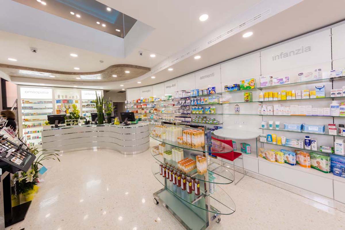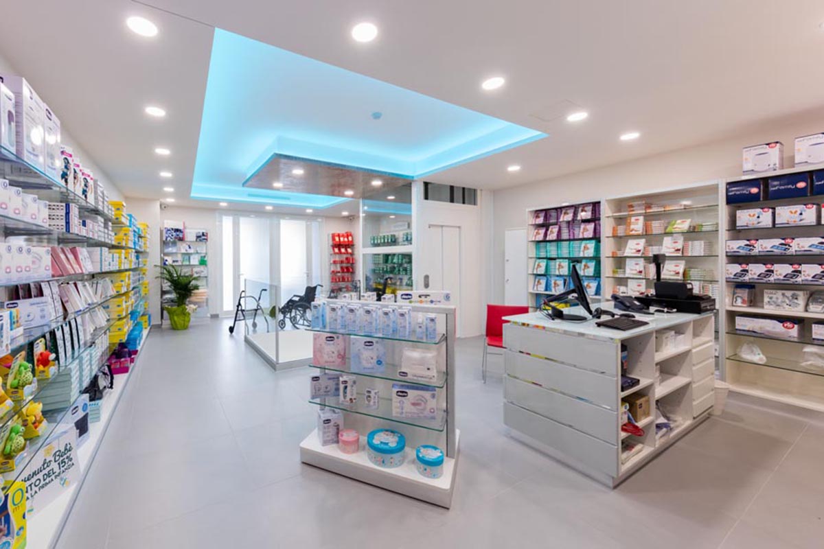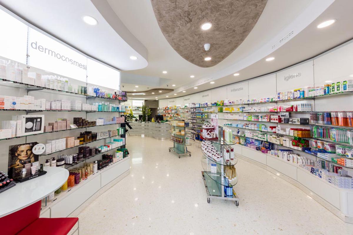 Le forme avvolgenti dei controsoffitti seguono l’andamento dell’arredamento farmacia e accompagnano il cliente alla scoperta dei diversi settori merceologici, tutti adeguatamente illuminati grazie a un ricercato sistema illumino-tecnico.
