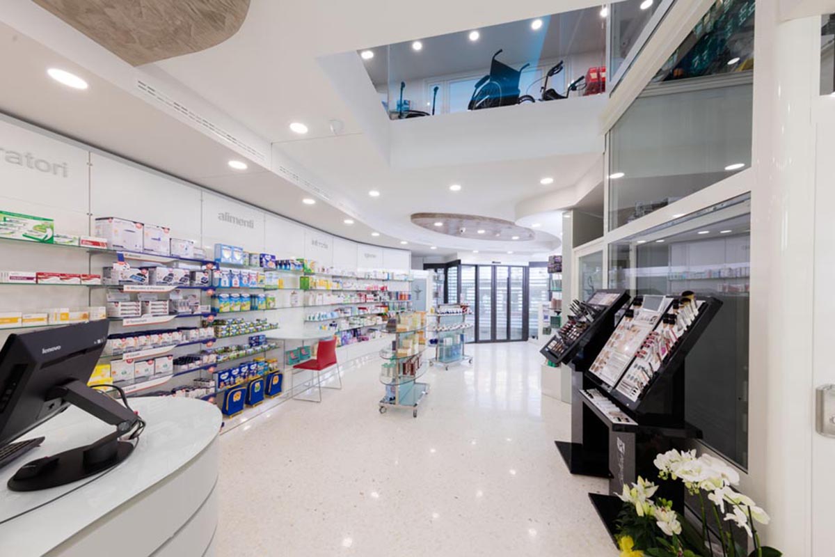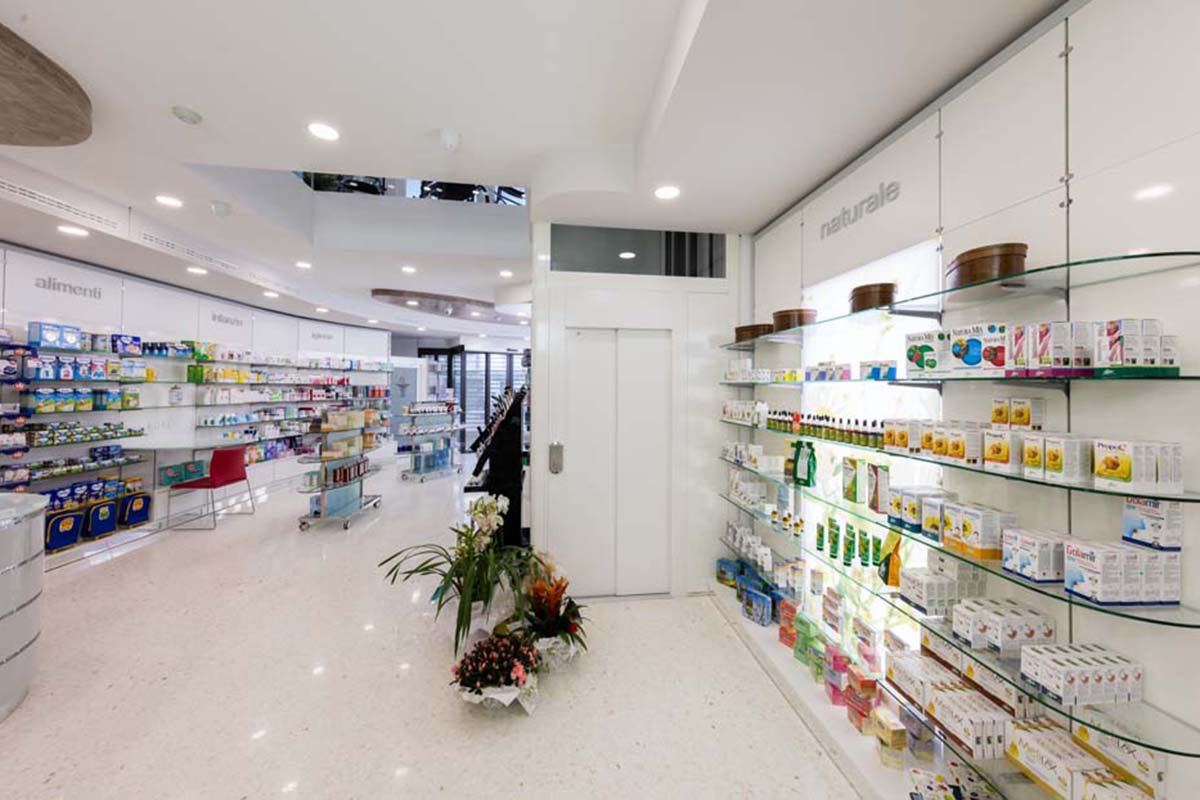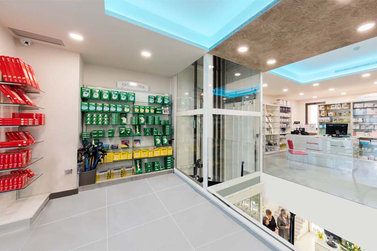 Uno spazio farmacia articolato su tre distinti livelli collegati con ascensore panoramico interno; un ruolo di grande rilevanza per i reparti specializzati di Sanitaria e Ortopedia, con assistenza e consiglio dedicati. Il secondo piano è invece progettato per ospitare una professionale Sala Riunioni e Conferenze e la sede di un ampio magazzino farmacia.