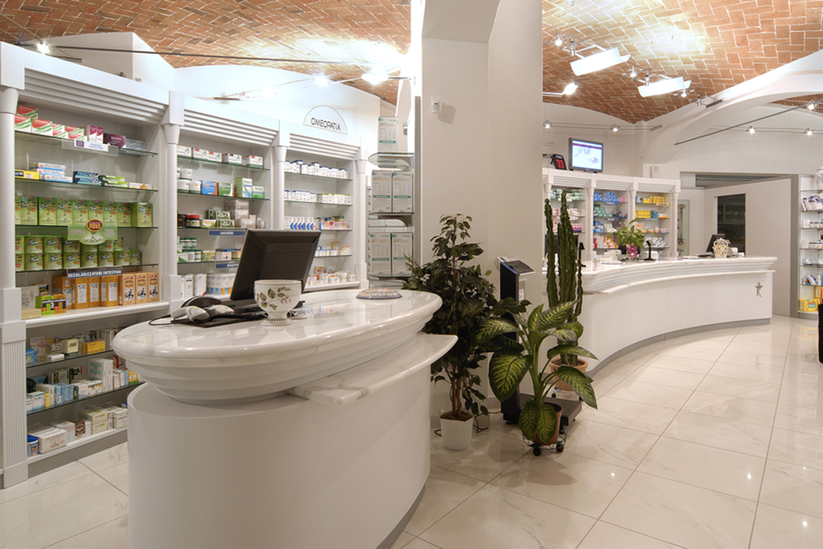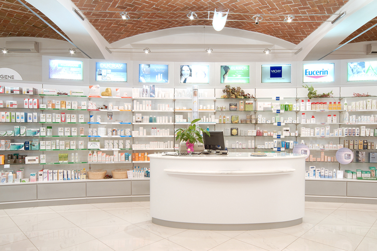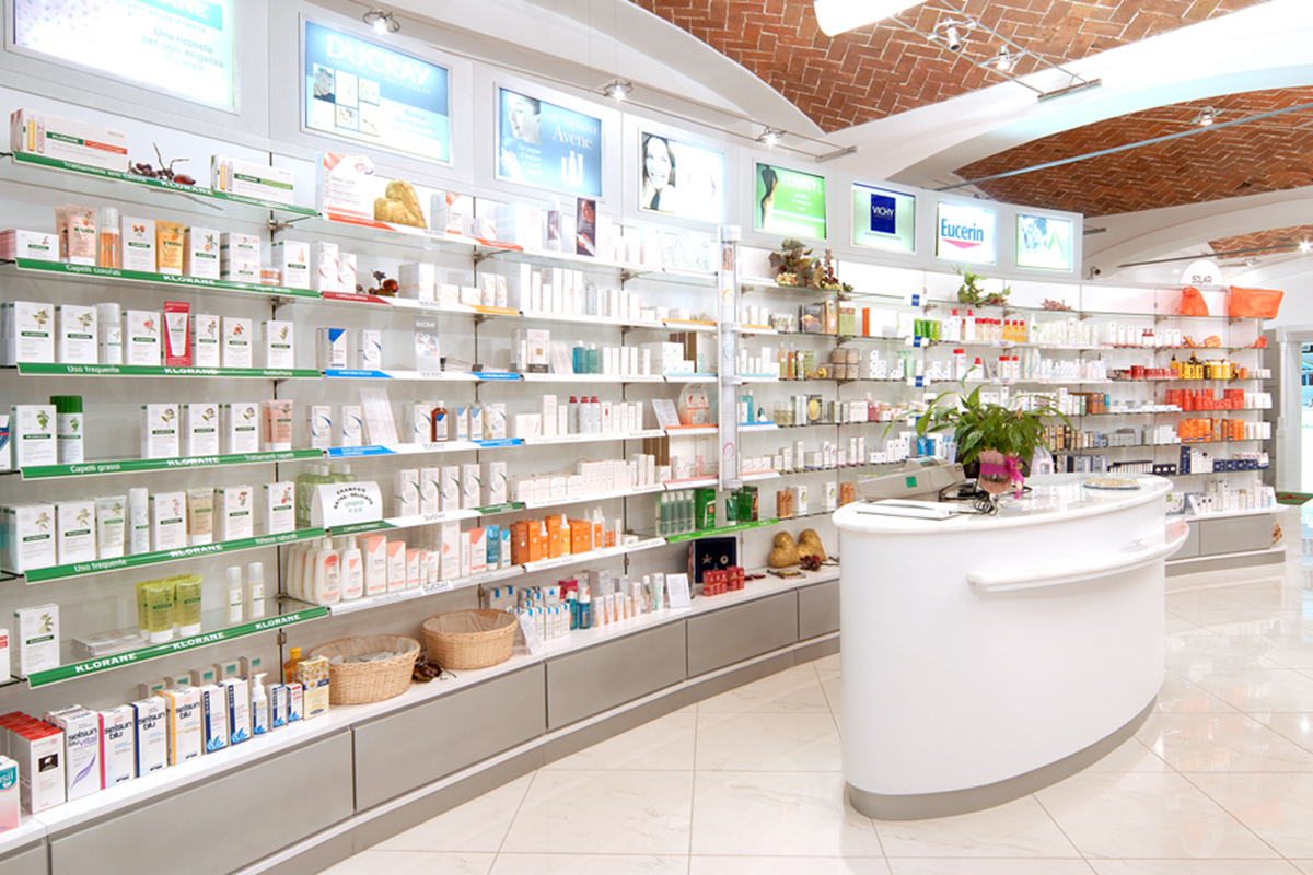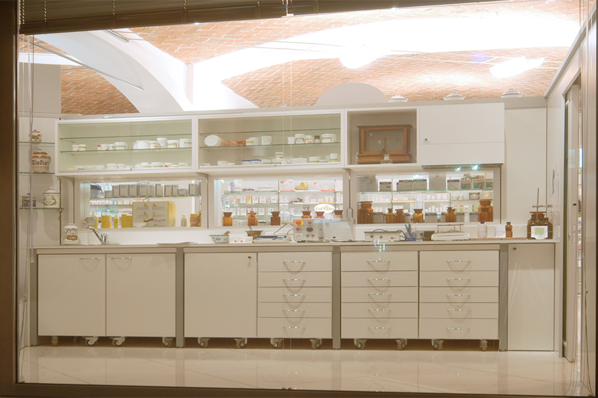 Dieci le vetrine al pubblico, una delle quali riservata al laboratorio galenico, volutamente a vista per trasmettere e rispecchiare la professionalità del farmacista.