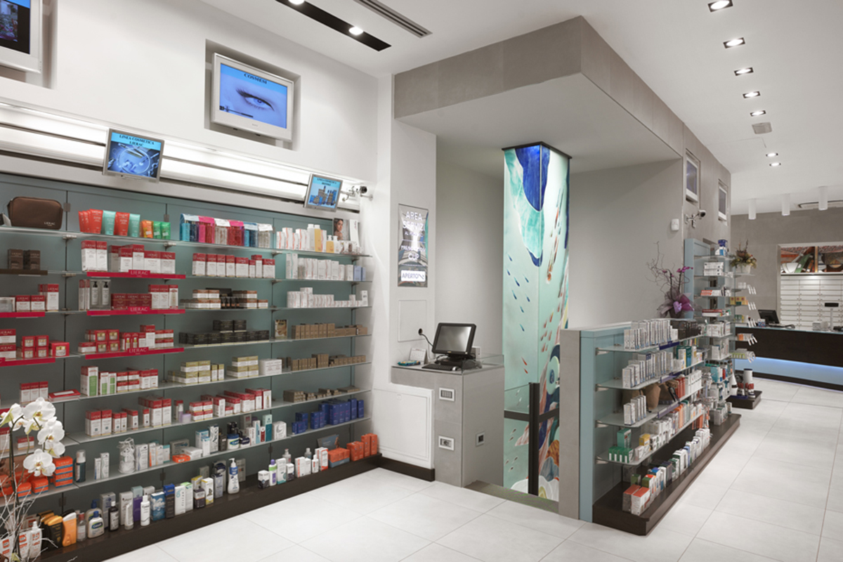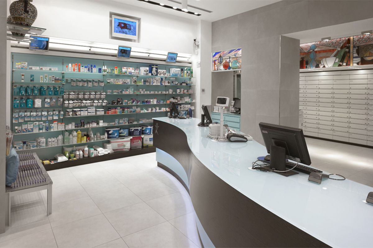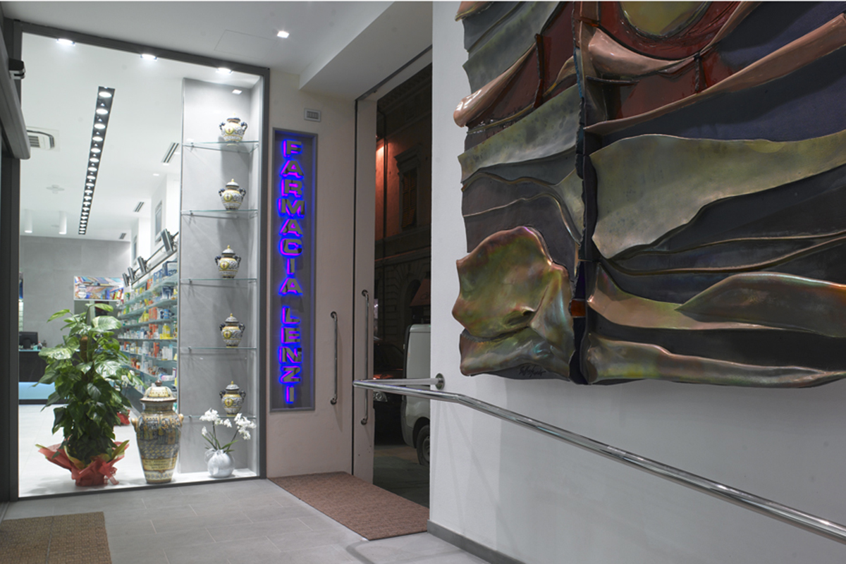 L’arredamento farmacia è sobrio ed elegante, fortemente caratterizzato dall’inserimento di opere d’arte che regalano personalità e unicità alla farmacia. L’unione di soluzioni illuminotecniche ottimali, tonalità raffinate e pregiati materiali crea dettagli originali.