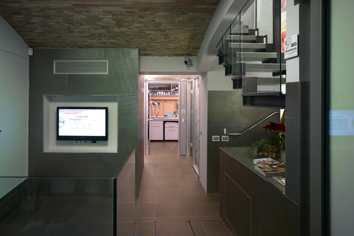 Sviluppato su due piani, lo spazio farmacia si articola in due zone diverse, ma complementari: al piano terra si estende l’area vendita, collegata al piano inferiore dove sono collocati e si sviluppano tutti i servizi offerti dalla farmacia. I due livelli sono in comunicazione mediante una scala a sbalzo che avvolge la colonna strutturale, enfatizzata e trasformata in opera di design grazie all’utilizzo del vetro decorato retroilluminato.
