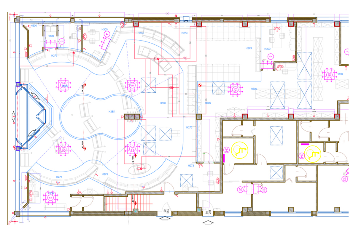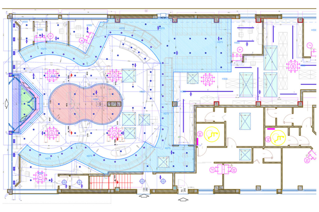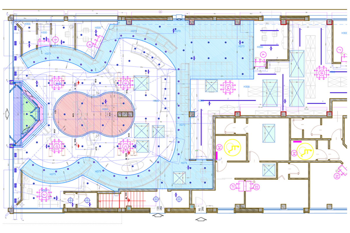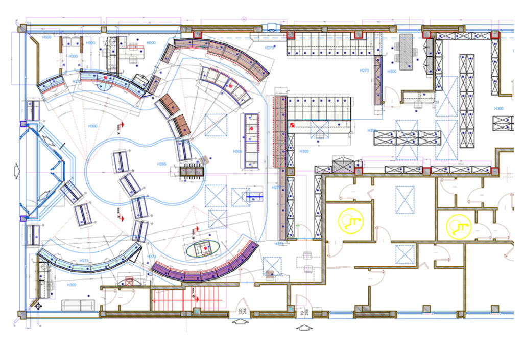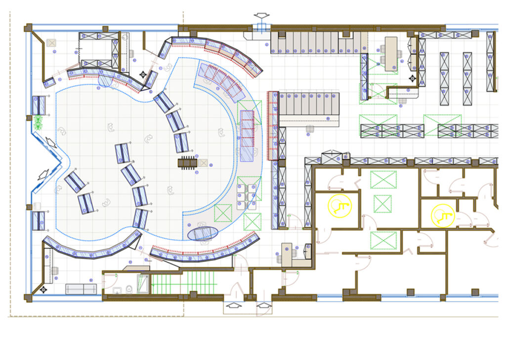 • Layout farmacia e distribuzione degli arredi progettati nel pieno rispetto dei principi di egonomia;